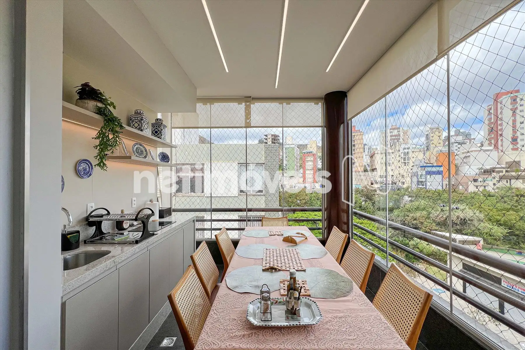 Varanda gourmet com bancada em granito, armários, cooktop e fechamento em vidro;