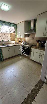 Cozinha ampla com armário, bancada em granito fogão e coifa