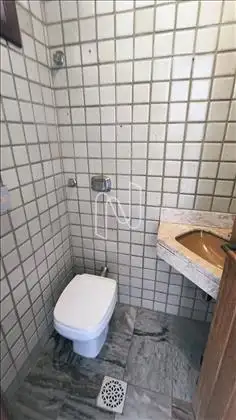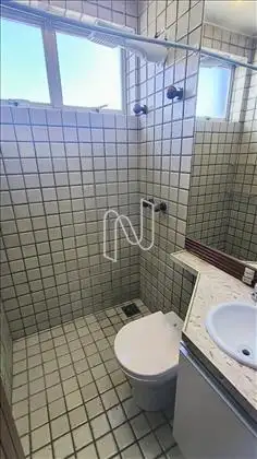 Banho social (01 suíte), pisos em cerâmica, armário sob a bancada de granito, box com vidro temperado.